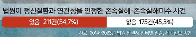 이런 비극을 맞닥뜨린 건 미정의 가정뿐일까. 그렇지 않다. 전국에서 매년 20건이 넘는 참극이 벌어지고 있다. ‘적절한 치료를 받지 못한’ 정신질환자가 자신을 돌봐온 부모를 해하는 사건이 도돌이표처럼 반복되는 것이다. 27일 세계일보가 지난 10년간(2014∼2023년) 있었던 존속살해·존속살해미수 사건 1심 판결문 386건을 전수 분석해 확인한 결과다. 이 중 재판부가 정신질환의 영향을 인정한 경우가 211건으로, 절반 이상을 차지했다. 부모나 조부모 등을 살해했거나 살해하려 한 범인 중 54.7%가 정신질환자였다는 의미다.