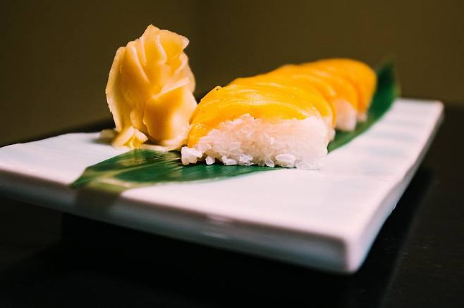 초로 간을 한 밥에 송어를 얇게 펴서 올린 뒤 대나무 잎으로 감싼다. 송어와 밥, 그야말로 정직한 맛이라 그 어떤 것보다 재료가 중요한 음식이다. 다테아마 연봉에서 흘러 내려오는 맑은 물은 벼 재배와 송어 양식에 최적의 조건을 만들어 준다고 한다. 마스노스시는 그야말로 도야마의 물이 만든 명물인 셈이다. 송어는 비린 맛 없이 고소한 풍미와 씹을수록 퍼지는 특유의 감칠맛이 매력적이다.