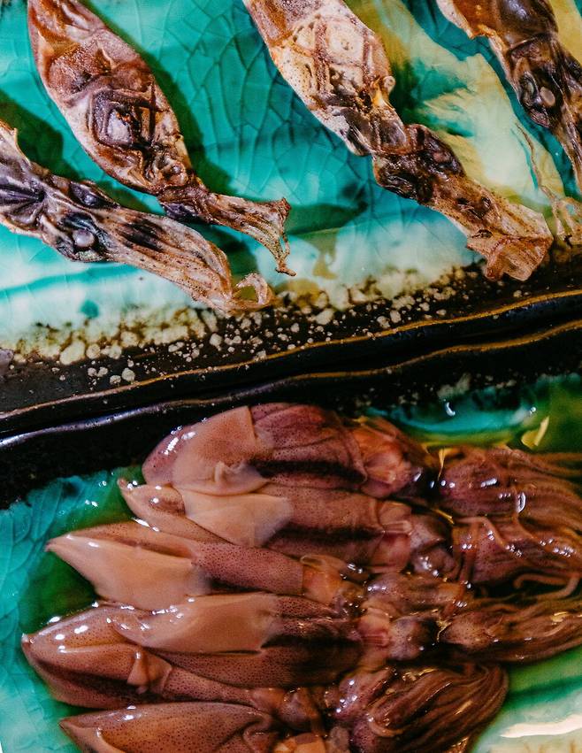 도야마의 명물, 호타루이카는 주로 말려서 먹거나 간장에 절여서 먹는다. 가볍게 쪄서 초된장과 생강을 곁들여 먹어도 좋다. 간장에 절인 호타루이카는 아삭거리는 식감이 매력적인데 달큰한 사케와 완벽한 페어링을 자랑한다. 말린 호타루이카는 숯불에 살짝 구워 먹으면 맥주 안주로 그만이다. 바짝 말라 보이지만 한 입 씹으면 녹진하게 흘러나오는 짭조름한 내장 맛이 아주 일품이다.