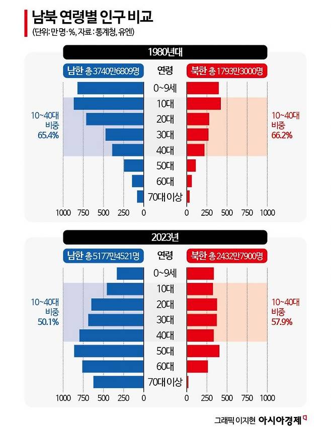 인구 구성비를 보면 북한에서 이 세대가 가진 영향력을 짐작해볼 수 있다. 정확한 통계치가 없는 북한은 유엔(UN) 인구 추계치, 남한은 통계청 자료를 기반으로 세대별 비율을 비교했다. 장마당세대가 태어나기 시작한 1980년 남한의 10~40대 비율은 65.4%, 북한은 66.2%로 비슷한 수준이었다. 지난해 남한은 50.1%까지 떨어진 반면, 북한은 장마당세대에 해당하는 10~40대가 57.9%로 높았다. 20·30세대로 좁혀도 남한은 25.9%, 북한은 30.8%로 차이가 벌어진다.