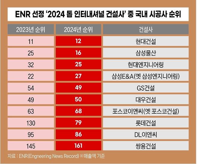 지정학 리스크와 경기 불황에 따라 발주도 많지 않지만 손실 리스크 탓에 적극적인 수주도 어려운 실정이다. 미국 건설전문 매체 ENR이 발표한 2024년 국제 건설사 순위(매출 기준) 중 상위 10대 기업에 속한 국내 건설사는 없었다.