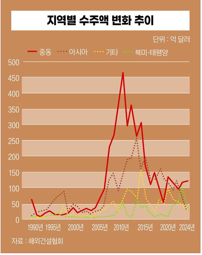 이 같은 상황에서 시공 자체보다 설계·엔지니어링과 관리 역량 확충이 필요하다는 지적이 꾸준히 제기됐다. 미국과 유럽 수주가 어려운 이유도 단순 시공만으로는 까다로운 선진국 감리 수준을 맞추면서 수익을 보기 어렵기 때문이라는 것이다. 국내 건설사의 해외 수주액이 지속 감소하는 가운데 중동·아시아 비중이 여전히 높은 이유다. 그나마 최근 수주액이 증가한 북미 지역 프로젝트는 그룹사의 현지 생산시설 공사가 대부분인 것으로 알려졌다.