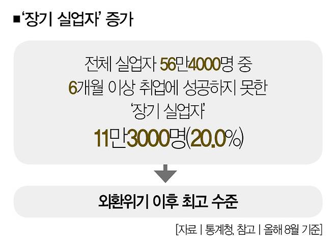 통계청에 따르면 지난 8월 기준 실업자는 56만4000명으로 집계됐다. 그중 구직기간이 6개월 이상인 '장기 실업자'는 11만3000명(20.0%)이었다. 외환위기 여파가 이어지던 1999년 8월(20.1%) 이후 25년 만에 최고 수준이다.