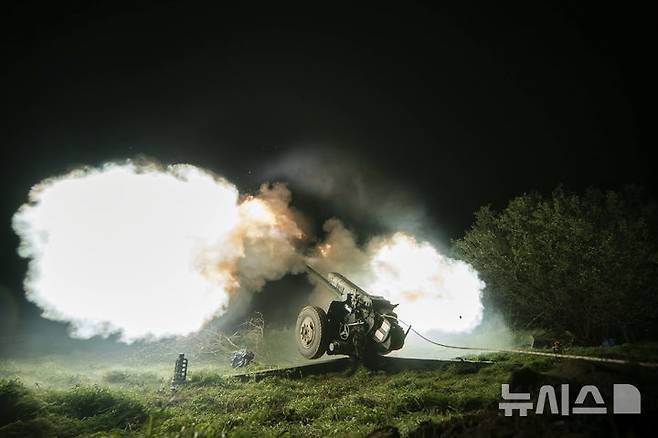 [헤르손=AP/뉴시스] 27일(현지시각) 우크라이나 헤르손에서 우크라이나 군인들이 러시아 진지를 향해 122㎜ 포를 발사하고 있다. 2024.10.28.
