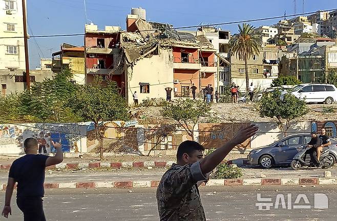[시돈=AP/뉴시스] 27일(현지시각) 레바논 남부 항구도시 시돈에서 레바논 군인들이 이스라엘의 공습으로 파괴된 건물 주변으로 접근하는 기자들을 통제하고 있다. 2024.10.28.