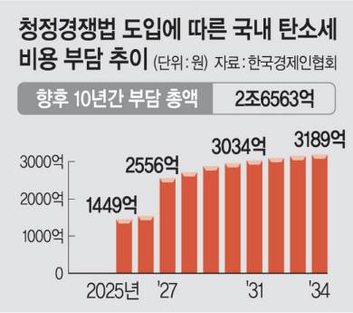 한경협은 CCA가 도입될 경우 2025∼2034년 총 2조7000억 원의 탄소세 부담이 국내 기업에 발생한다고 예상했다. 적용 범위에 따라서는 원자재에 1조8000억 원, 완제품에 9000억 원이 발생할 것으로 전망됐다. 업종별로는 석유 및 석탄제품업(1조1000억 원)과 화학제조업(6000억 원)이 가장 큰 영향을 받는 것으로 추정됐다.