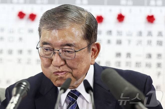 (도쿄 AFP=뉴스1) 우동명 기자 = 이시바 시게루 일본 총리가 27일(현지시간) 도쿄 자민당 당사에서 총선 패배와 관련한 인터뷰를 하고 있다. 2024.10.28