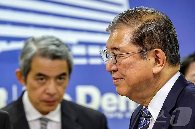 (도쿄 AFP=뉴스1) 우동명 기자 = 이시바 시게루 일본 총리가 27일(현지시간) 도쿄 자민당 당사에서 총선 패배와 관련한 인터뷰에 도착을 하고 있다. 2024.10.28
