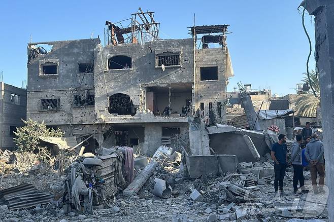 (베이트 라히아 AFP=뉴스1) 우동명 기자 = 27일(현지시간) 팔레스타인 가자지구 북부 베이트 라히아에서 헤즈볼라와 전쟁 중인 이스라엘 군의 공습을 받아 폐허로 변한 건물이 보인다. 2024.10.28