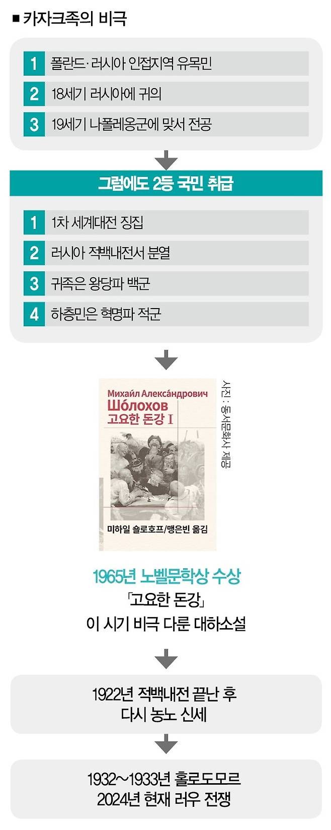 카자크족은 러시아 현대사의 격랑에 휘말려 처절한 고통을 겪은 민족이다. 18세기 러시아에 귀의했지만, 그 이후에도 '2등 국민' 취급을 받았다. 러시아를 위해 싸우고, 목숨을 받쳤지만 결과는 늘 '핍박'이었다. 1932~1933년 우크라이나에서 발생한 '홀로도모르(Holodomor·기아에 의한 대량 학살)'도, 2024년 지금의 러-우크라 전쟁도 그런 비극의 연장선에 서있다.