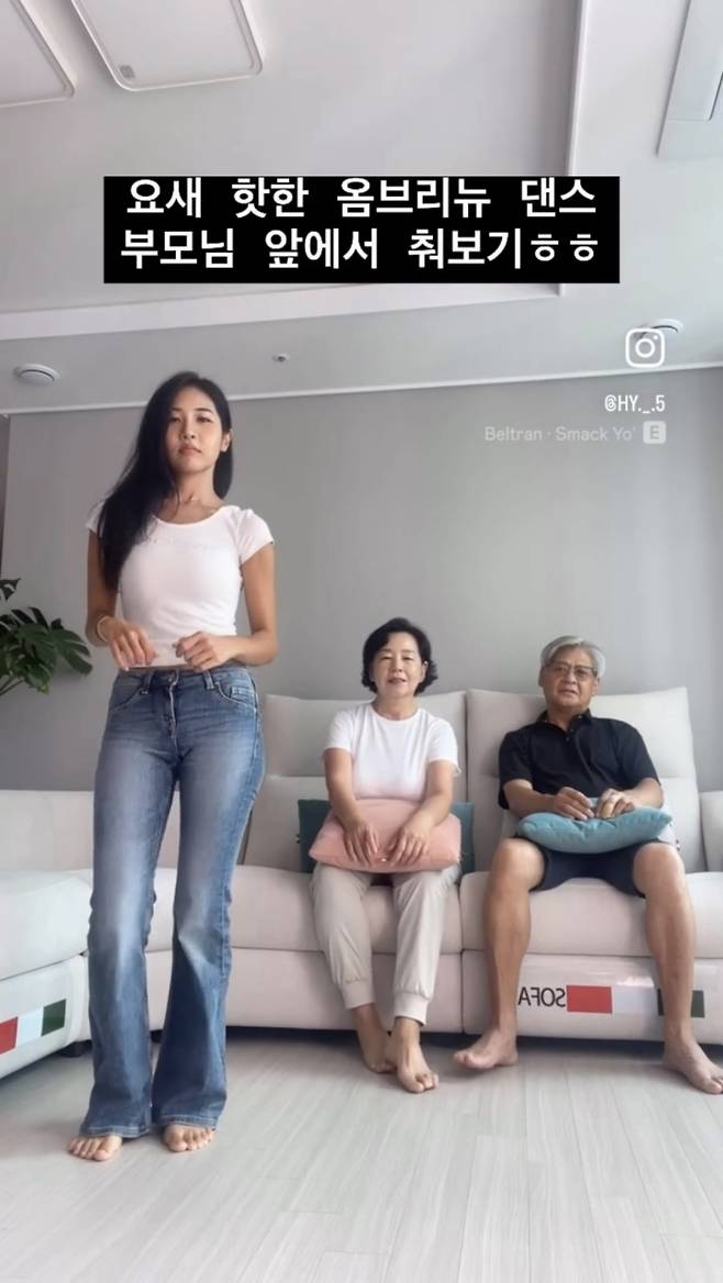 이 영상에서 오혜연은 쇼파에 앉자 있는 부모님 앞에서 최근 SNS에서 유행하고 있는 옴브리뉴 댄스 챌린지를 선보이고 있다.