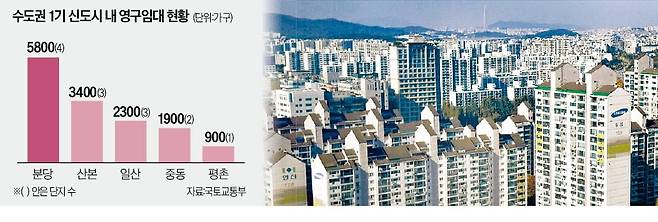국토부에 따르면 1기 신도시 내 영구임대주택은 분당 5800가구와 일산 2300가구, 평촌 900가구, 산본 3400가구, 중동 1900가구 등 1만4000가구 수준이다. 특히 분당은 4개 단지 5800가구를 이주대책 지원형 정비구역으로 설정해 이주 수요를 해결한다는 계획을 세웠다.