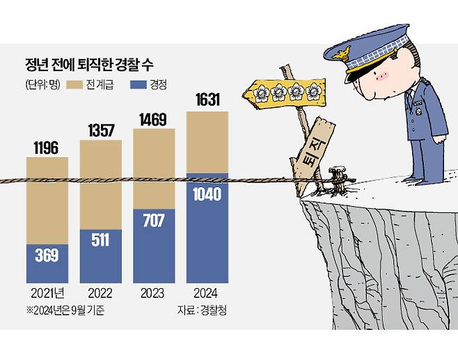 28일 경찰청에 따르면 올 들어 지난 9월까지 비간부 연령 정년인 60세를 채우지 못하고 중도 퇴직한 경감·경정은 1040명으로 역대 최대 규모를 기록했다. 정년 전에 자발적으로 퇴직하거나 계급 정년(14년)에 걸려 경찰복을 벗은 이를 합친 수치다. 경감·경정 중도 퇴직자는 2021년 369명에서 2022년 511명, 2023년 707명으로 꾸준히 늘었다.