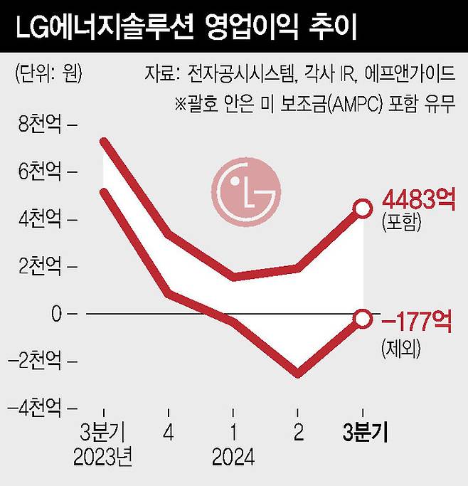 엘지에너지솔루션은 28일 올해 3분기 영업이익이 4483억원으로 지난해 같은 기간 대비 38.7% 감소했다고 공시했다. 매출은 6조8778억원으로 같은 기간 16.4% 줄었다. 이는 미국에서 생산된 전기차 배터리 셀·팩 등에 대해 세액 공제 혜택을 주는 걸 뼈대로 하는 미국 인플레이션감축법(IRA)에 따라 돌려받은 첨단제조생산세액공제(AMPC) 금액 4660억원을 포함한 것이다. 이를 제외하면 177억원의 영업손실을 냈다. 미국 정부 지원금을 뺀 ‘자기 실력’만으로는 적자가 나는 상황인 셈이다.