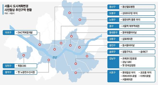 28일 본지가 서울시로부터 단독 입수한 자료에 따르면 이날 현재 서울시에서 사전협상 대상으로 지정된 곳을 비롯해 사전협상이 진행 중인 곳, 지구단위계획 결정고시까지 완료된 지역은 모두 20곳으로 나타났다.