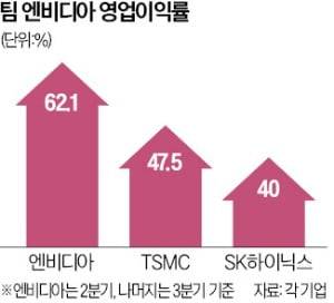28일 반도체업계에 따르면 최첨단 고대역폭메모리(HBM)를 엔비디아에 납품하는 SK하이닉스와 엔비디아가 설계한 프로세서를 만들고 HBM과 묶는 파운드리(반도체 수탁생산) 업무를 담당하는 TSMC의 올 3분기(7~9월) 영업이익률은 각각 40%와 47.5%에 달했다. 엔비디아의 2025회계연도 2분기(2024년 5~7월) 영업이익률(62.1%)엔 못 미치지만, 이렇게 높은 수익을 내는 반도체 기업은 찾아보기 힘들다.