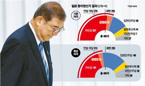 연립 여당인 공명당은 24석으로 이를 합친 여당 의석수는 215석으로 중의원 총수 465석의 과반인 233석에 못 미쳤다. 연립 여당의 선거 전 의석수는 279석이었다. 연립 여당이 총선에서 과반 의석을 놓친 것은 옛 민주당에 정권을 내준 2009년 이후 15년 만이다.