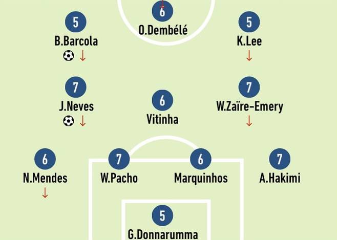 이날 이강인은 가짜 9번이 아닌 오른쪽 윙어로 선발 출전해 약 78분을 뛰었다. 그는 4-3-3 전형에서 바르콜라와 뎀벨레와 함께 최전방 스리톱을 구성했고, 9번 공격수 역할은 뎀벨레가 맡았다.