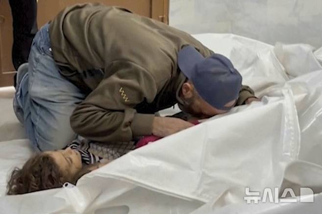 [칸유니스(가자지구)=AP/뉴시스]가자지구 남부 칸유니스의 한 병원 영안실에서 25일 한 남성이 이스라엘군의 공습으로 숨진 친척에게 마지막 키스를 하고 있다. 가자지구에서 1년 넘게 계속된 전쟁으로 숨진 팔레스타인인 사망자가 4만3000명을 넘어 4만3020명에 달했으며, 절반 이상은 여성과 어린이라고 팔레스타인 보건부가 28일 밝혔다. 2024.10.28.