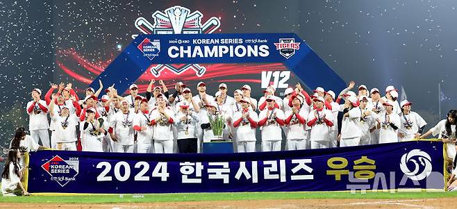 [광주=뉴시스] 김금보 기자 = 28일 광주 북구 광주-기아챔피언스필드에서 2024 KBO 포스트시즌 한국시리즈 4승 1패의 기록으로 통합 우승을 차지한 KIA 타이거즈 선수들이 기념촬영을 하고 있다. 2024.10.28. kgb@newsis.com