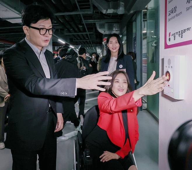| 韓, 주차장 비상벨 확인 국민의힘 한동훈 대표(왼쪽)가 28일 서울 동작구 서울가족플라자를 방문해 주차장에 설치된 비상벨을 확인하고 있다. 한 대표는 이날 당내 격차해소특별위원회 3차 현장방문에서 “우리(보수의) 지향점은 ‘강강약약’에 가깝다”며 “보수는 사회와 공동체에 대한 책임이 있다”고 강조했다. 뉴시스 |
