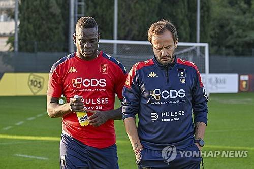Mario Balotelli, left, and Genoa's head coach Alberto Gilardino attend a training session in Genoa, Italy, Monday, Oct. 28, 2024. (Tano Pecoraro/LaPresse via AP) ITALY OUT; MANDATORY CREDIT