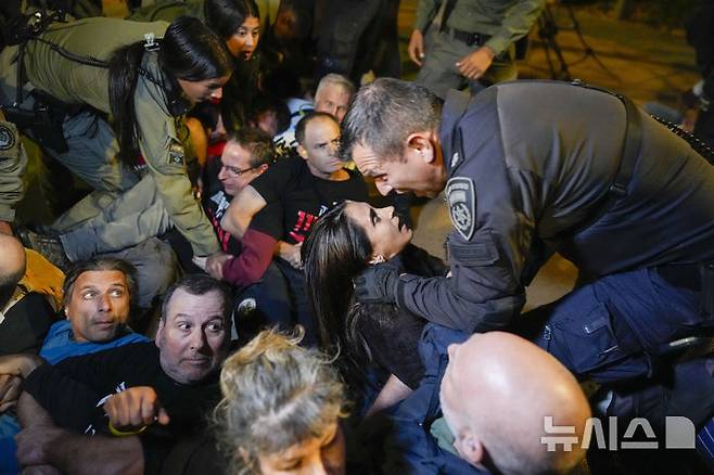 [예루살렘=AP/뉴시스] 28일(현지시각) 이스라엘 예루살렘 총리 관저 인근에서 경찰이 베냐민 네타냐후 총리 정부에 반대하며 하마스에 억류된 인질 석방을 요구하는 시위대를 해산시키면서 한 여성에게 고함치고 있다. 2024.10.29.