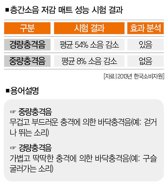 경량충격음은 가볍고 딱딱한 충격, 중량충격음은 무겁고 부드러운 충격에서 기인하는 소리를 뜻한다. 층간소음은 주로 중량충격음에서 발생한다. A씨는 "층간소음으로 인한 극단적인 갈등은 주로 중량충격음 때문에 발생한다는 걸 감안하면 매트는 갈등을 줄이는 데 아무런 효과가 없는 셈"이라고 꼬집었다.