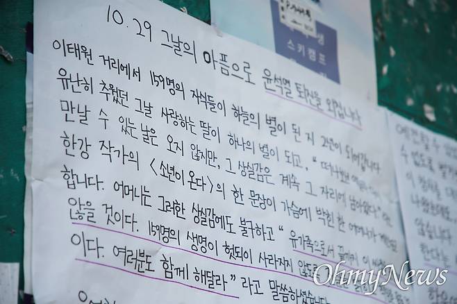 이태원 참사 2주기를 맞아 부산대학교 등 부산 지역의 대학가에 유가족의 호소에 응답하는 대자보가 나붙었다.