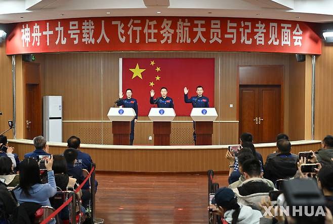 [주취안=신화/뉴시스] 29일(현지시각) 중국 간쑤성 주취안 위성발사센터에서 30일 선저우 19호 우주 비행 임무를 수행할 왕하오저(왼쪽부터), 차이쉬저, 쑹링둥이 기자회견 하면서 포즈를 취하고 있다. 이들은 선저우 18호 우주인들과 교대해 내년 4~6월까지 우주정거장 '톈궁'에 머물며 임무를 수행한다. 선저우 18호는 다음 달 4일 지구로 귀환한다. 2024.10.29.