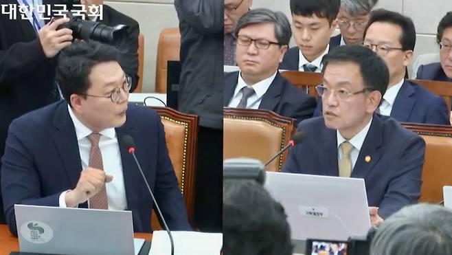 | ▲ 29일 국회 기획재정위원회의 기획재정부 국정감사에서 천하람 개혁신당의원(왼쪽)이 최상목 경제부총리겸 기획재정부장관에게 질의를 하고 있다. |