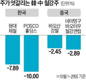 지난달 중국 정부가 경기부양책을 발표한 이후 동반 상승한 한국, 중국 철강주가 최근 엇갈리고 있다.