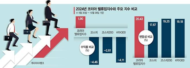같은 기간 코리아 밸류업 지수의 샤프지수는 0.09인 반면 코스피는 -0.25, 코스피200은 -0.14, KRX300은 -0.21 등이다.