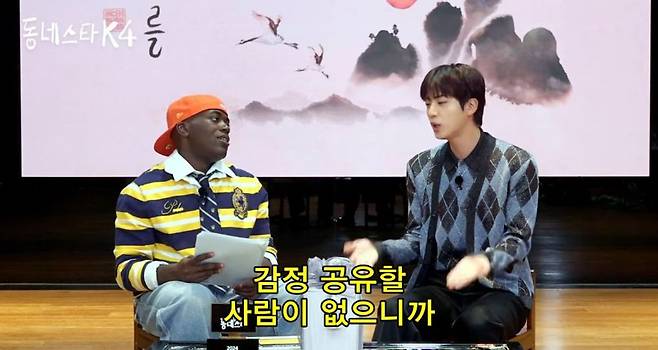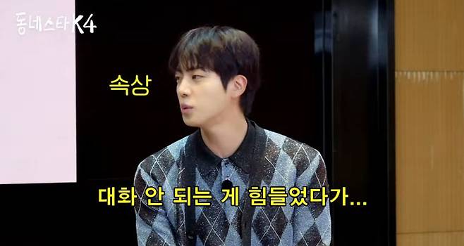방탄소년단의 맏형으로 멤버들 중 가장 먼저 병역의 의무를 이행한 진은 "처음 들어갔을 땐 감정을 공유할 사람이 없었다. 내 또래 친구들은 군대를 갔다 온지 10년이 넘다 보니 대화가 안 되는 게 힘들었다"라고 털어놨다.