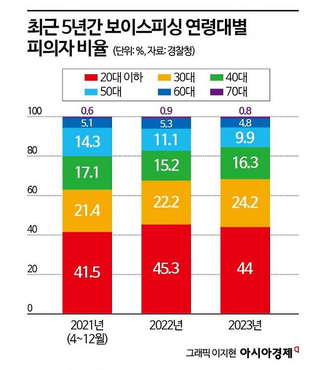 30일 아시아경제가 정보공개청구를 통해 입수한 '보이스피싱 피해자 통계' 자료에 따르면 지난해 보이스피싱 전체 피해자 1만8902명 중 20대 이하는 8886명에 달한다. 전체 비율로 따지면 47%로 2019년(10.2%) 대비 4배 이상 증가했다. 성별로는 20대 남성(6391명)이 여성(2495명)과 비교해 훨씬 많았다.