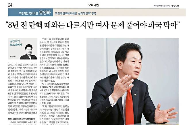 30일자 중앙일보에 국민의힘 유영하 의원(초선·대구 달서갑) 인터뷰가 실렸다. 박근혜 전 대통령의 측근인 유영하는 박근혜가 대통령직에서 물러나 감옥살이를 하는 동안 그의 변호인을 맡았고, 그 이후에도 언론의 접촉창구 역할을 하는 인물.