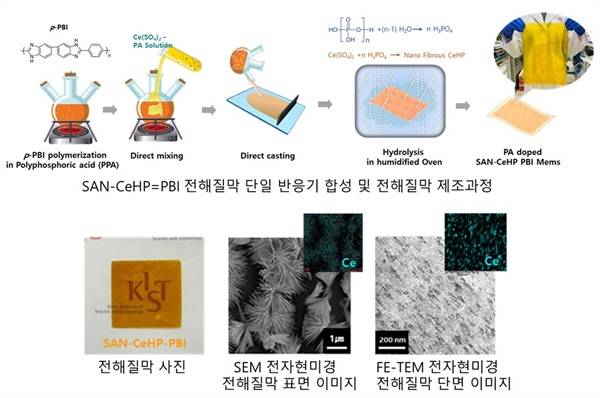 이에 공동 연구팀은 이번 연구에서 KIST의 '세륨포스페이트 자가조립 기술'에 한국에너지공과대학교의 '파라-폴리벤지이미다졸(p-PBI) 합성 기술'을 접목한 신규 합성법을 개발했다. 이를 통해 기존 PBI(Polybenzimidazole, 초고내열성 수지) 기반 전해질막보다 150~300°C 범위에서도 뛰어난 전기화학적 성능과 내구성을 유지하는 데 성공했다.