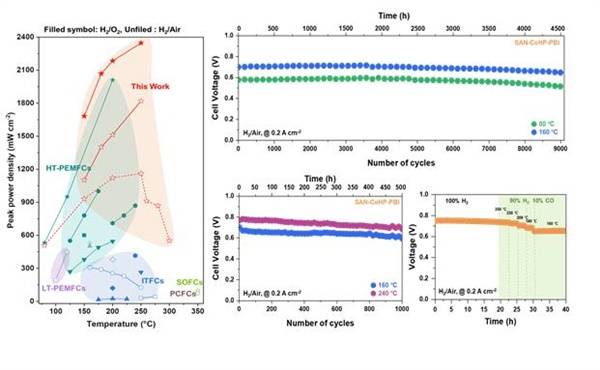 특히 이번에 개발한 'SAN-CeHP-PBI' 기반의 연료전지는 250°C 조건에서 최대 출력 밀도가 세계 최고 수준인 2.35 W/cm²를 달성했으며, 80~160°C 열 사이클링 테스트(다양한 온도 조건에서 성능을 테스트하는 방법)에서 기존 대비 10배 이상의 5000시간 이상의 장시간 운전이 가능함을 입증해냈다.