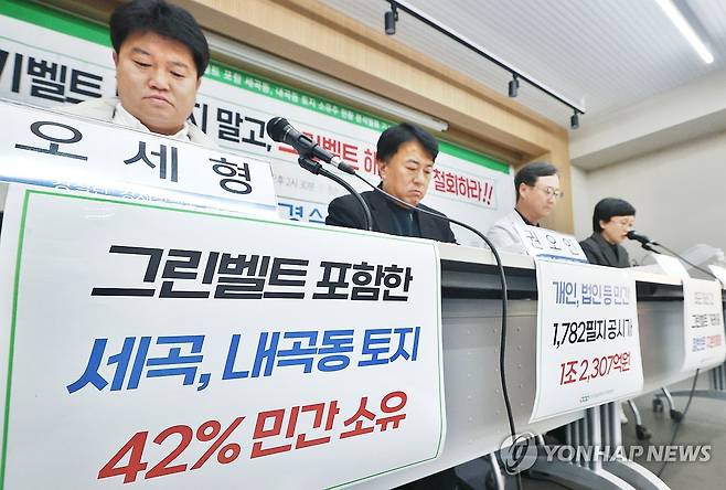 (서울=연합뉴스) 진연수 기자 = 경제정의실천시민연합 도시개혁센터 관계자들이 30일 오후 서울 종로구 경실련에서 그린벨트 포함 세곡동·내곡동 토지 소유주 현황 분석발표 기자회견을 하고 있다. 2024.10.30