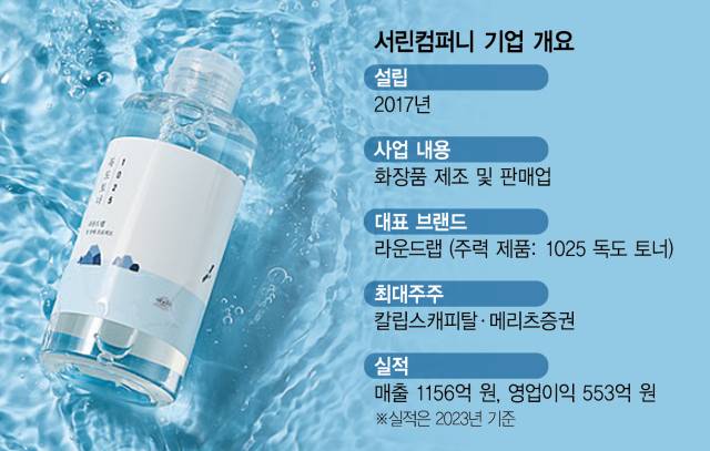 매각 입찰을 진행 중인 서린컴퍼니는 이영학·정서린 대표가 2017년 공동 설립한 화장품 제조사다. 화장품 브랜드 라운드랩을 운영하고 있으며 주력 제품인 ‘1025 독도 토너’로 잘 알려져 있다. 독도 토너는 울릉도 해양심층수의 미네랄 성분을 주요 원료로 사용한 제품으로 출시 초기부터 대규모 마케팅 없이 입소문만으로 인기를 끌었다. 독도 토너가 2019년 올리브영에 입점하면서 회사 매출도 급성장했다. 서린컴퍼니의 매출액은 2020년 364억 원에서 2021년 530억 원, 2022년 572억 원, 2023년 1156억 원으로 증가했다. 지난해 영업이익은 553억 원으로 전년 대비 두 배 넘게 늘었다.