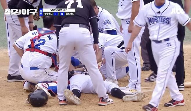 지난 28일 방영된 '최강야구' 최강 몬스터즈와 안산공고의 경기 중 김경민 선수는 9회 초 대타로 나와 니퍼트의 투구에 턱을 맞고 쓰러졌다.