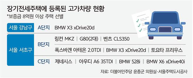 주거취약계층을 위해 공급된 장기전세주택에 사는 일부 세입자들이 외제차를 비롯한 고가의 차량을 개인 명의로 등록해 사용하고 있는 것으로 파악됐다.