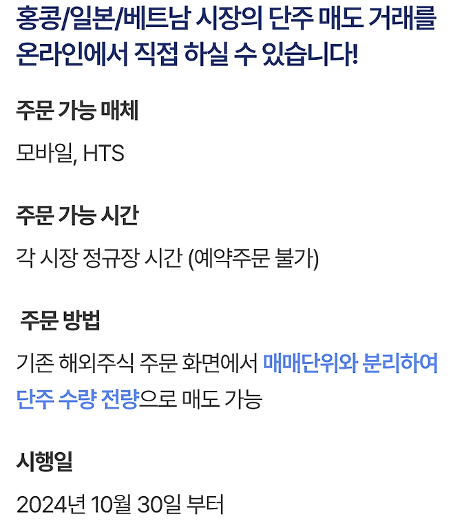NH투자증권은 오늘(30일)부터 홍콩·일본·베트남 시장 단주 매도 거래를 모바일트레이딩시스템(HTS)·홈트레이딩시스템(HTS)에서도 가능하도록 서비스를 개선했다고 어제(29일) 공지했습니다.