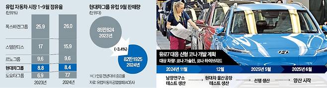 현대차그룹이 유로7 차량 개발에 나선 건 뒷걸음치고 있는 유럽 시장을 재건하기 위해서다. 현대차·기아의 1~9월 유럽 시장 판매량은 82만1925대로 전년 동기 대비 3.4% 줄었다. 같은 기간 유럽 시장 점유율(8.4%)도 0.4%포인트 내려갔다.