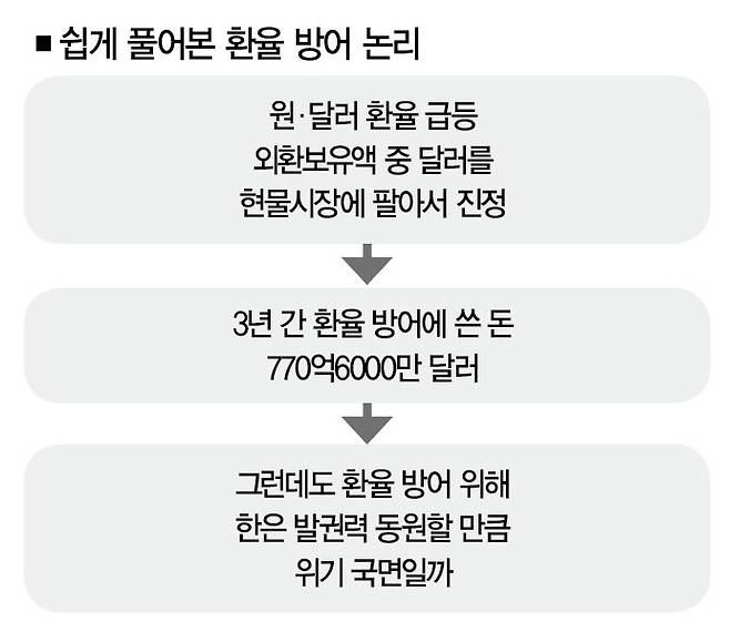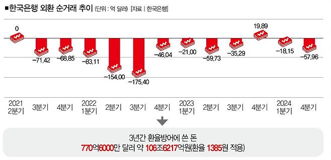 한은이 이런 식으로 최근 몇년간 환율방어에 투입한 돈은 100조 원이 넘는다. 외환당국인 한국은행의 분기별 외환 순거래 추이를 보면 지난 3년간 770억6000만 달러(약 106조6217억 원)를 환율방어에 썼다. 한은은 올해 1분기에도 환율을 방어하는 데 18억1500만 달러를 투입했고, 2분기에도 57억9600만 달러를 사용했다.