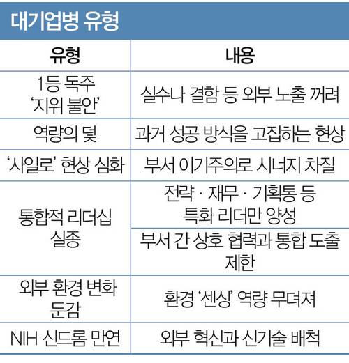 한국 경제 성장의 견인차 역할을 해왔던 대기업이 흔들리고 있다. 조직이 비대해지다 보니 ‘부서 이기주의’가 만연하면서 조직 간 의사소통, 혁신은 갈수록 어려워진다. 외부 환경 변화에 둔감한 상황에서 기존 성공 방식만 고집하면서 어느새 ‘중증 대기업병’ 환자로 전락했다는 우려다. 대기업병 사례를 유형별로 살펴본다.