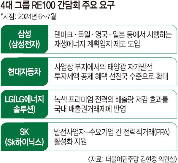 30일 김현정 더불어민주당 의원실에 따르면 삼성전자·현대차·LG에너지솔루션·SK하이닉스 4개 기업은 지난 6~7월 국무조정실 산하 2050탄소중립녹색성장위원회 사무처와 간담회를 갖고 재생에너지 개발·이용 시 인센티브 확대, 발전 부지 확보 지원, 전력 직거래 확대 등을 요청했다.
