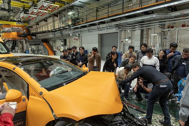 충돌 이후 기록 측정 및 사진을 찍었던 위쪽 장비가 철수하고 화재 위험을 막기 위해 안전 요원들이 투입돼 차의 상태를 살폈다. 또 고전압 담당자가 차로 다가와 정상적으로 전력이 끊어졌는지 확인이 이뤄졌다. 이후 안전하다고 판단한 뒤 연구원들이 차로 접근해 본격적인 결과값을 입력하기 시작했다.