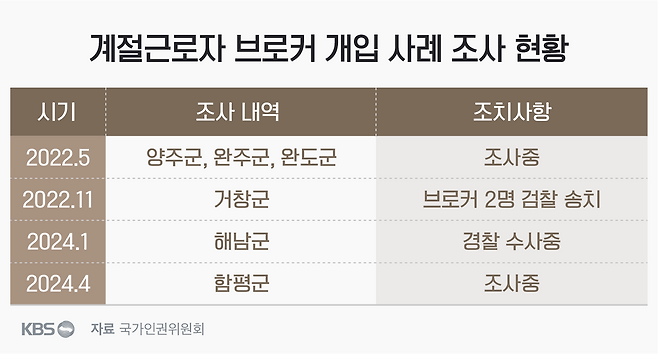 현재 브로커 개입 사례와 관련해 양구군, 완주군, 완도군, 거창군, 해남군, 함평군에 대한 조사가 진행 중이고 최근엔 안성시 사례에 대해서도 법무부가 조사에 착수했습니다.