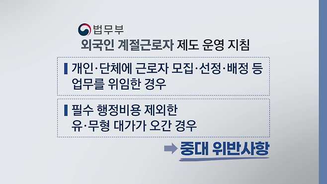 고용허가제의 경우 고용노동부가 '외국인고용법'에 따라 운영하고 있지만, 계절근로자 제도의 경우 별도의 근거 법률 없이 법무부 운영 지침에 따라 도입된 제도라 관리에 취약점이 있다는 겁니다.
